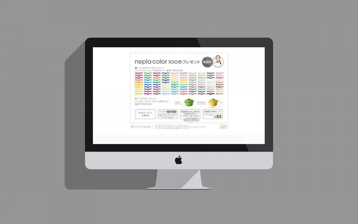 nepia web / works ネピア・カラー100色プレゼント ネピア・キャンペーンサイトをFull Flashで制作 Flash/Design Prev Blog Next 2007/12/25
